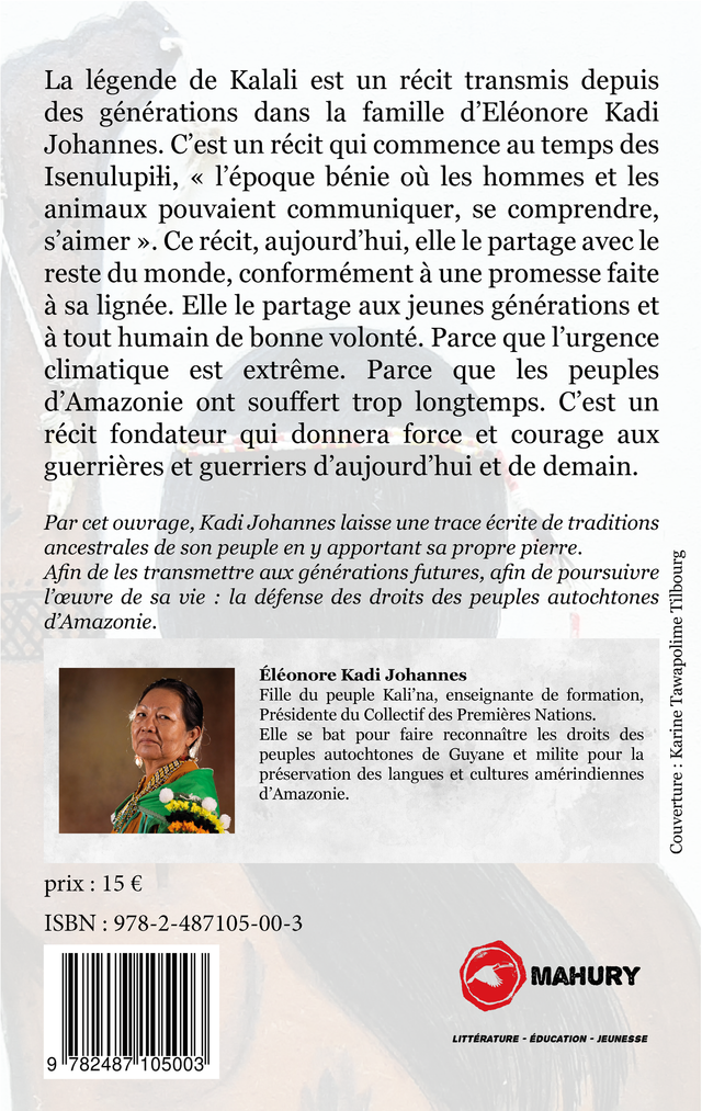 La légende de Kalali est un récit transmis depuis des générations dans la famille d’Eléonore Kadi Johannes. C’est un récit qui commence au temps des Isenulupili, « l’époque bénie où les hommes et les animaux pouvaient communiquer, se comprendre, s’aimer ». Ce récit, aujourd’hui, elle le partage avec le reste du monde, conformément à une promesse faite à sa lignée. Elle le partage aux jeunes générations et à tout humain de bonne volonté. Parce que l’urgence climatique est extrême. Parce que les peuples d’Amazonie ont souffert trop longtemps. C’est un récit fondateur qui donnera force et courage aux guerrières et guerriers d’aujourd’hui et de demain.