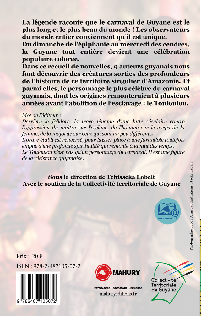 La légende raconte que le carnaval de Guyane est le plus long et le plus beau du monde ! Les observateurs du monde entier conviennent qu’il est unique. Du dimanche de l’épiphanie au mercredi des cendres, la Guyane tout entière devient une célébration populaire colorée. Dans ce recueil de nouvelles, 9 auteurs guyanais nous font découvrir des créatures sorties des profondeurs de l’histoire de ce territoire singulier d’Amazonie. Et parmi elles, le personnage le plus célèbre du carnaval guyanais, dont les origines remonteraient à plusieurs années avant l’abolition de l’esclavage : le Touloulou.